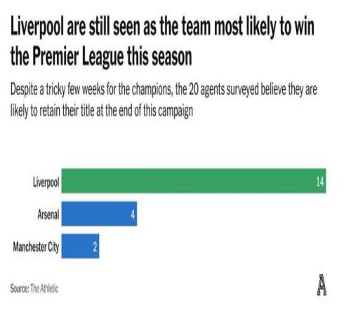 超过三分之二(14位)的经纪人预测利物浦将卫冕冠军,尽管他们在本次国际比赛日之前出现了波动。
