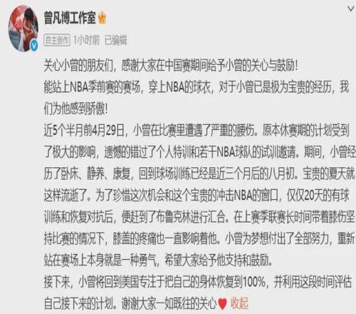 曾凡博工作室对此发表声明称,曾凡博将回到美国专注于把自己的身体恢复至100%。并评估下一步的计划。