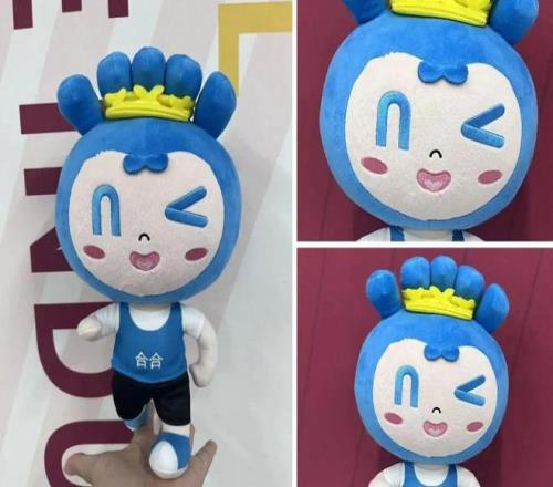 作为合肥马拉松的官方“吉祥物”,合合有着圆滚滚的头、象征巢湖的浪花样蓝色卷发,戴着簪有合肥市市花桂花的空顶小黄帽。它穿着印有“合合”字样的蓝色背心,一边wink一边奔跑。
