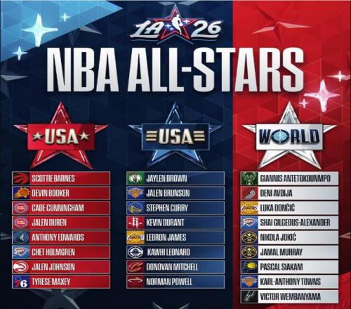 北京时间2月4日,NBA官方公布了2026全明星赛的分组,其中,詹姆斯、杜兰特和库里同在美国条纹队。