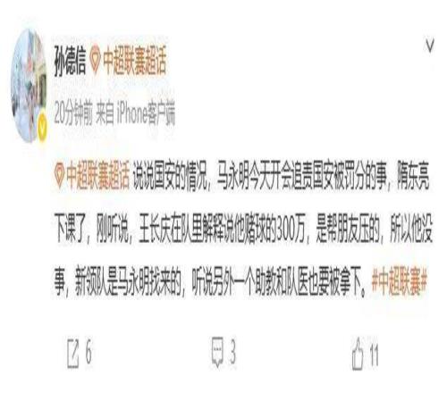 刚刚,媒体人孙德信在个人社交账号上发文称,北京国安新任体育总经理马永明今天开会追责了国安被罚分一事,最终结果是领队隋东亮下课,而王长庆因在解释之后则没有事。此外,孙德信称还有一位助理教练和队医也要被拿下。