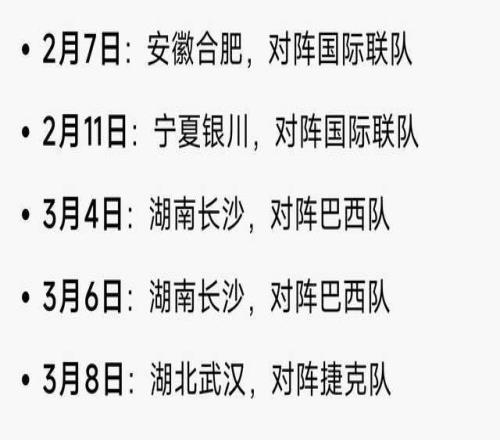 2月、3月的五场热身赛时间如下: